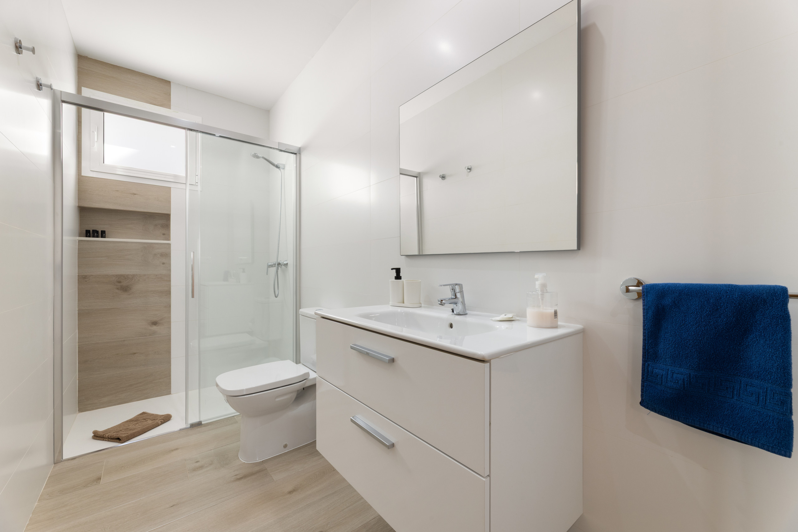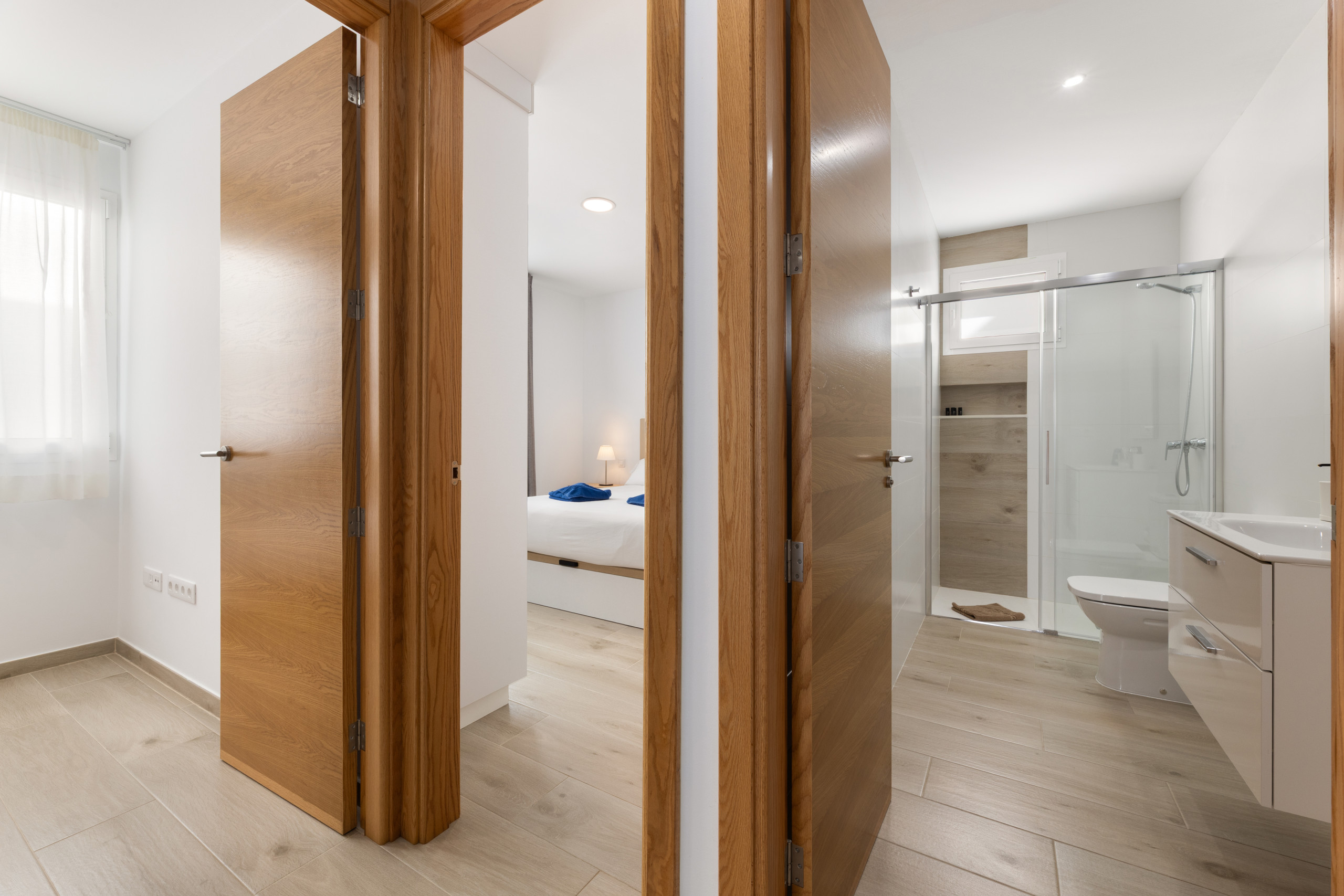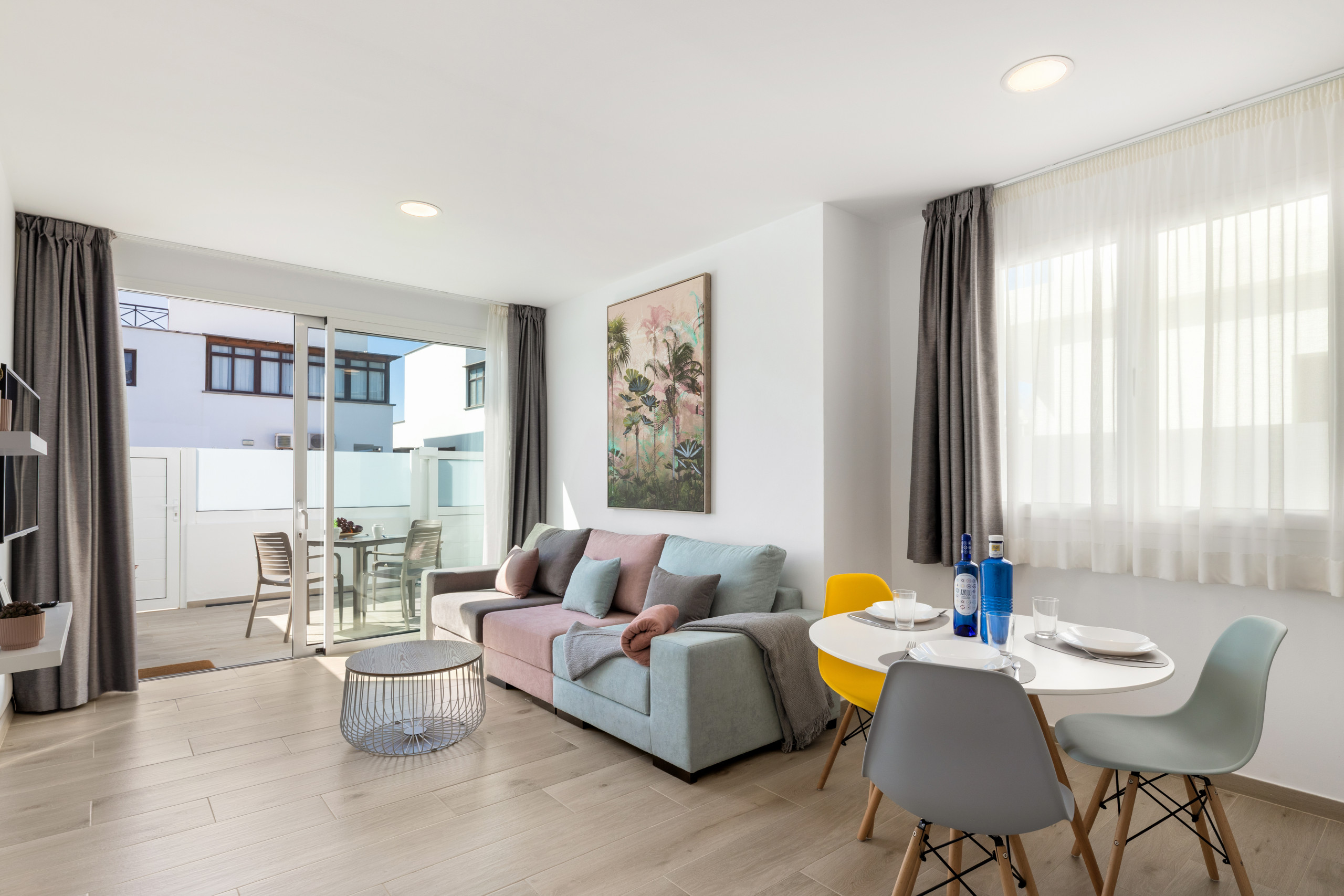 Dispone de dos dormitorios luminosos, decorados con un estilo moderno y acogedor, pensados para ofrecer descanso después de un día de playa o de excursiones. El aire acondicionado en las estancias principales garantiza confort durante todo el año, tanto en los días más calurosos como en las noches más templadas.