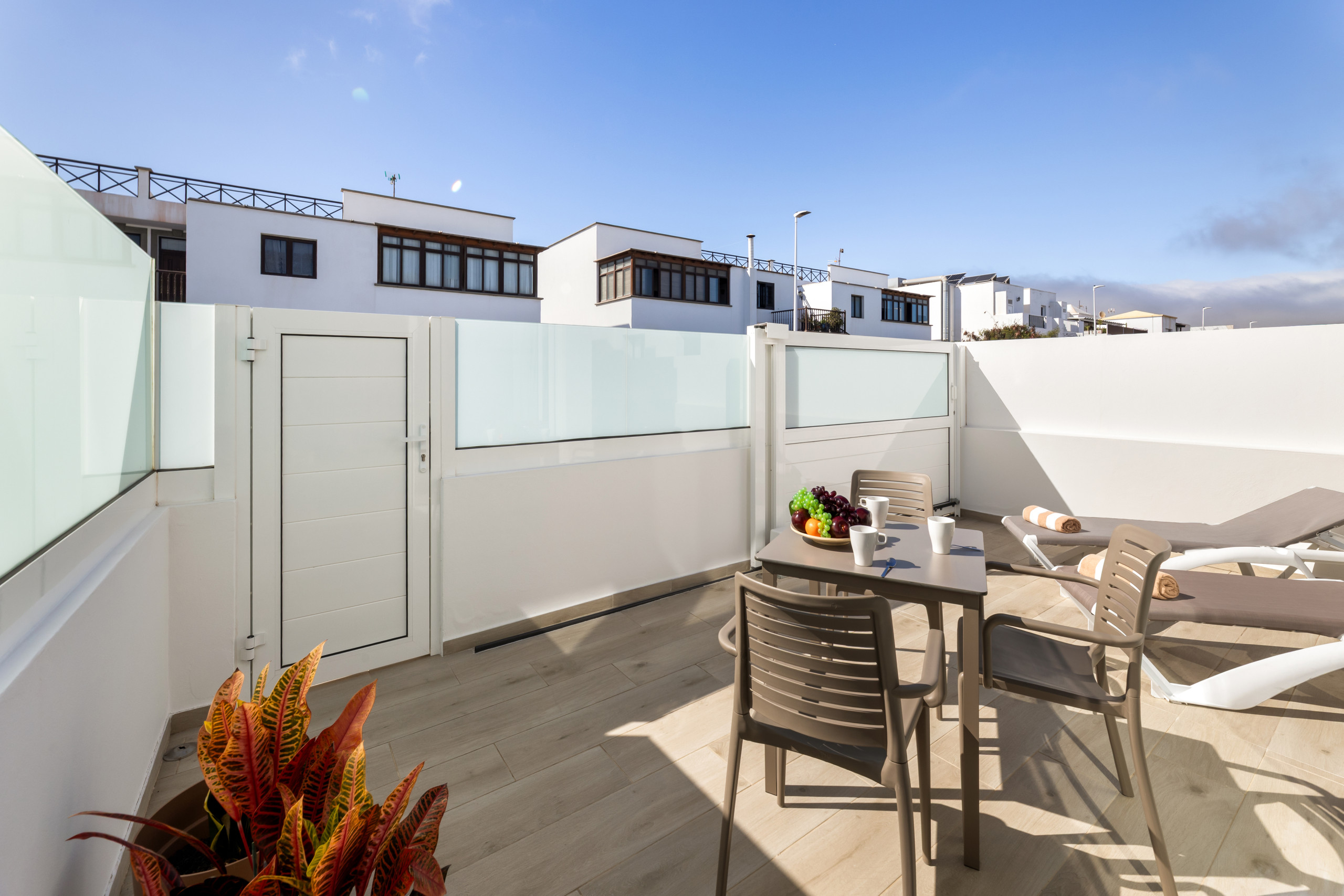 En el exterior, la terraza privada con tumbonas invita a desconectar al sol, leer un libro o disfrutar de un desayuno al aire libre antes de salir a explorar Lanzarote. Estás a un paseo de la playa, del paseo marítimo con sus restaurantes y cafeterías, y a pocos minutos en coche de lugares clave como Arrecife, el aeropuerto y las principales rutas para conocer la isla.