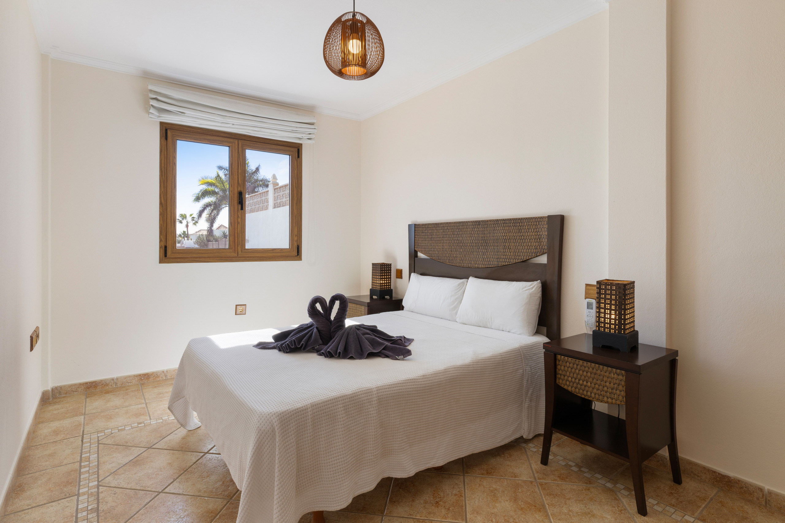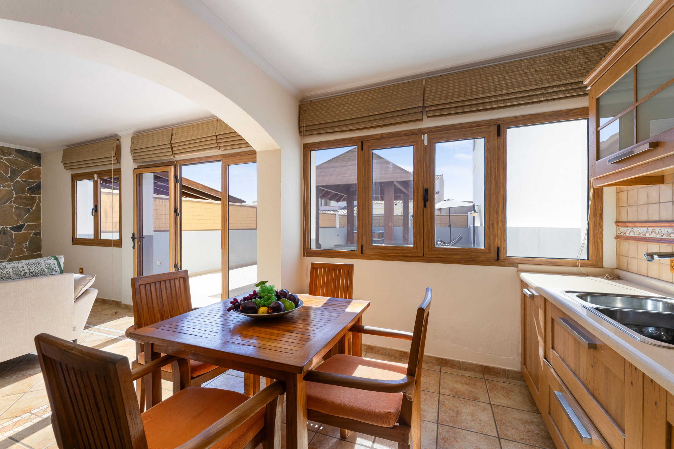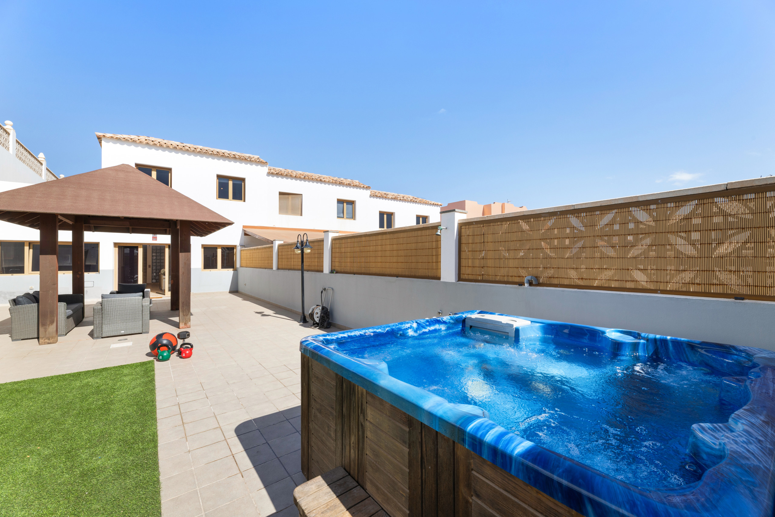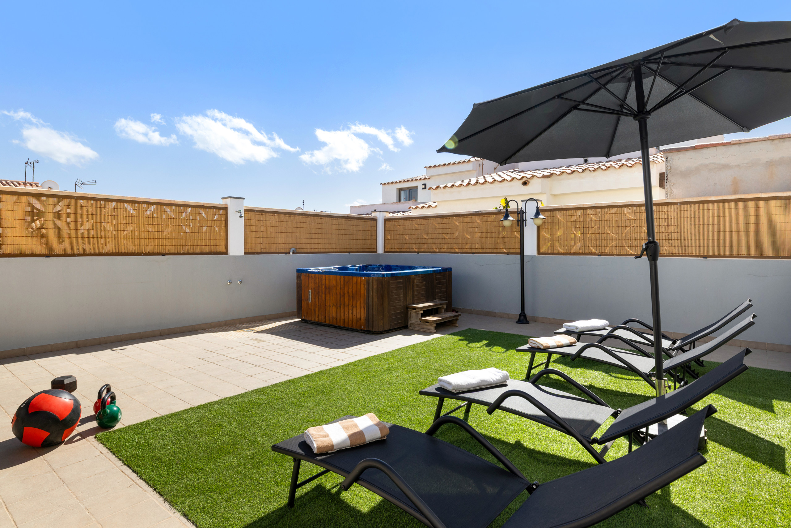 La terraza exterior ofrece el auténtico toque canario: un espacio inmenso para relajarse al sol, disfrutar de comidas al aire libre bajo el cenador o sumergirse en el jacuzzi mientras cae la tarde. Además, tanto las habitaciones como el salón disponen de aire acondicionado para mantener siempre la temperatura ideal.