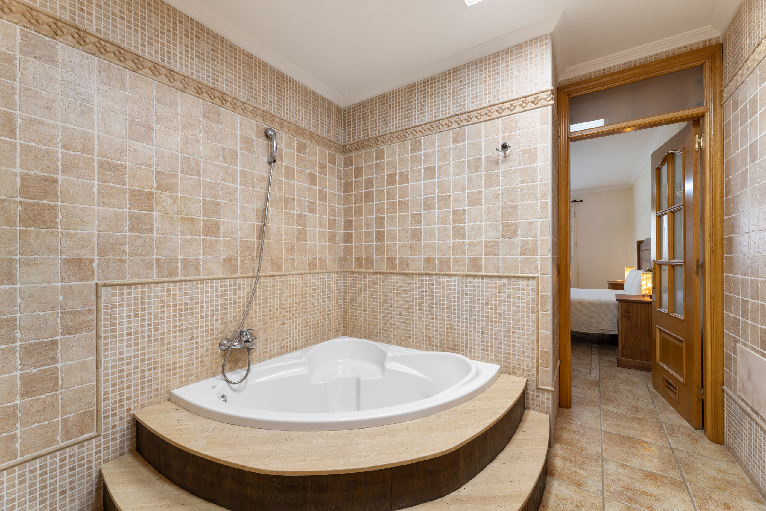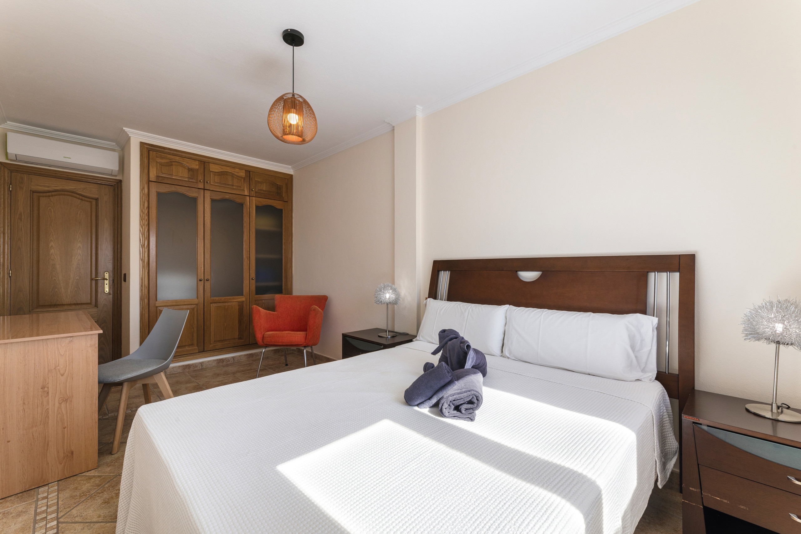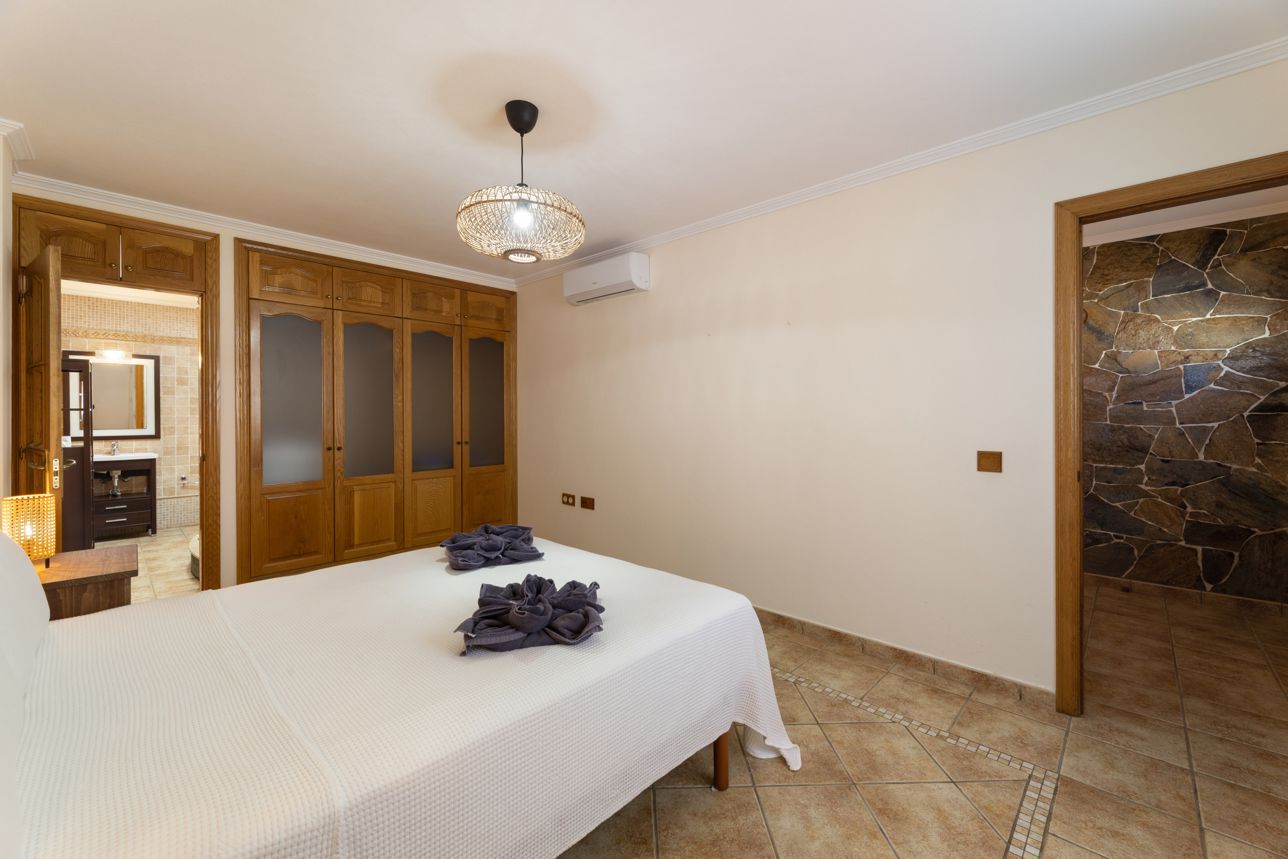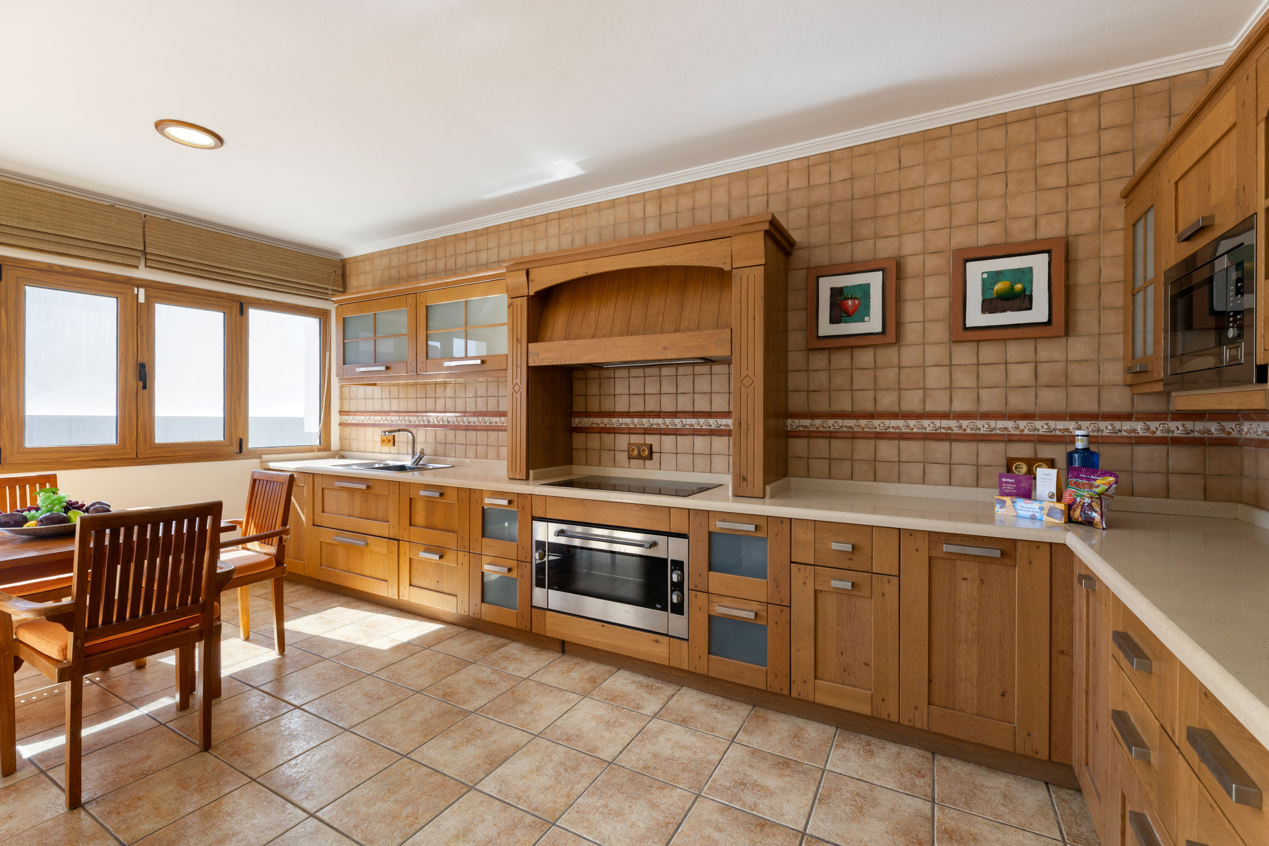 La terraza exterior ofrece el auténtico toque canario: un espacio inmenso para relajarse al sol, disfrutar de comidas al aire libre bajo el cenador o sumergirse en el jacuzzi mientras cae la tarde. Además, tanto las habitaciones como el salón disponen de aire acondicionado para mantener siempre la temperatura ideal.