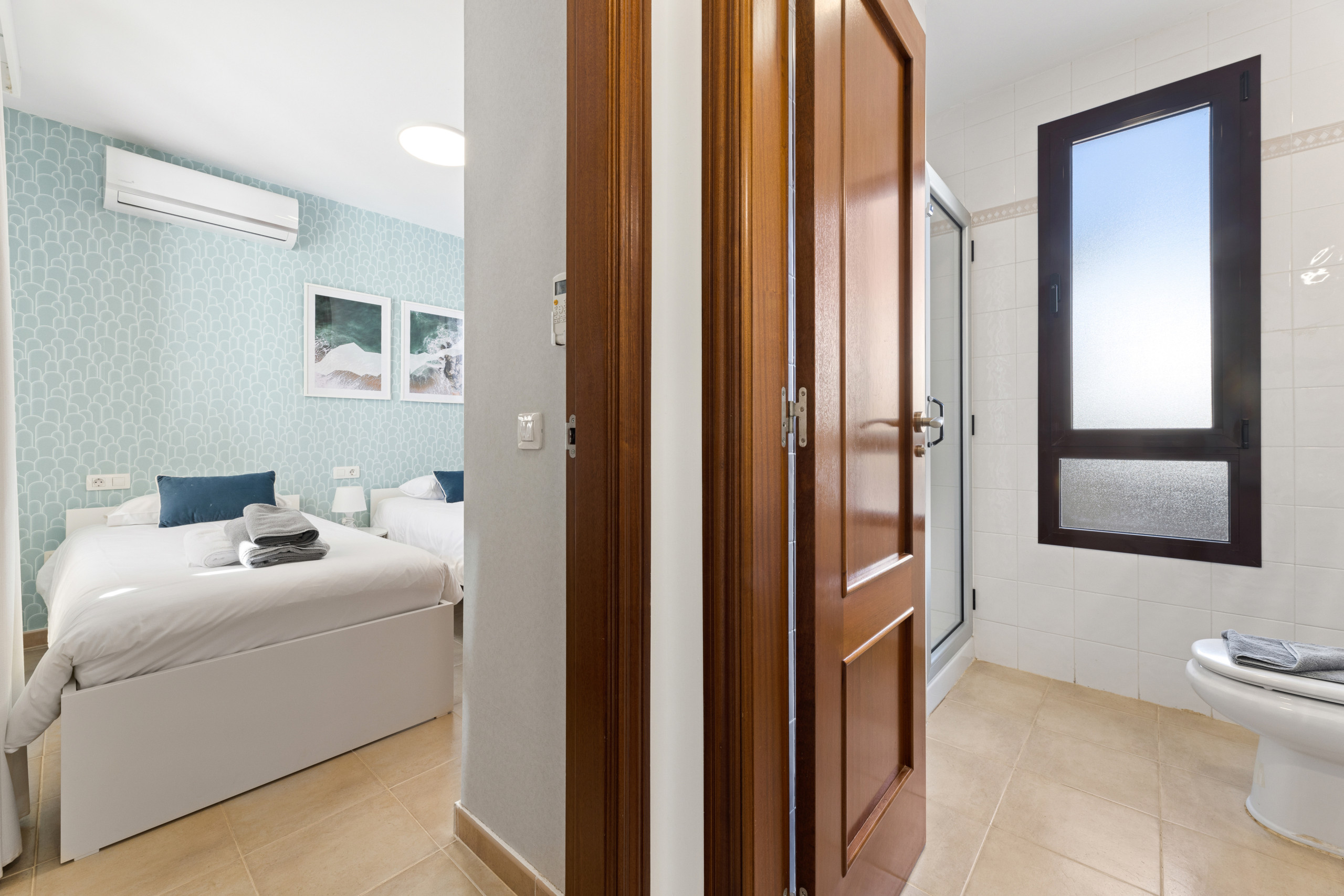 Second bedroom with two double beds and independent bathroom, perfect for groups or families.