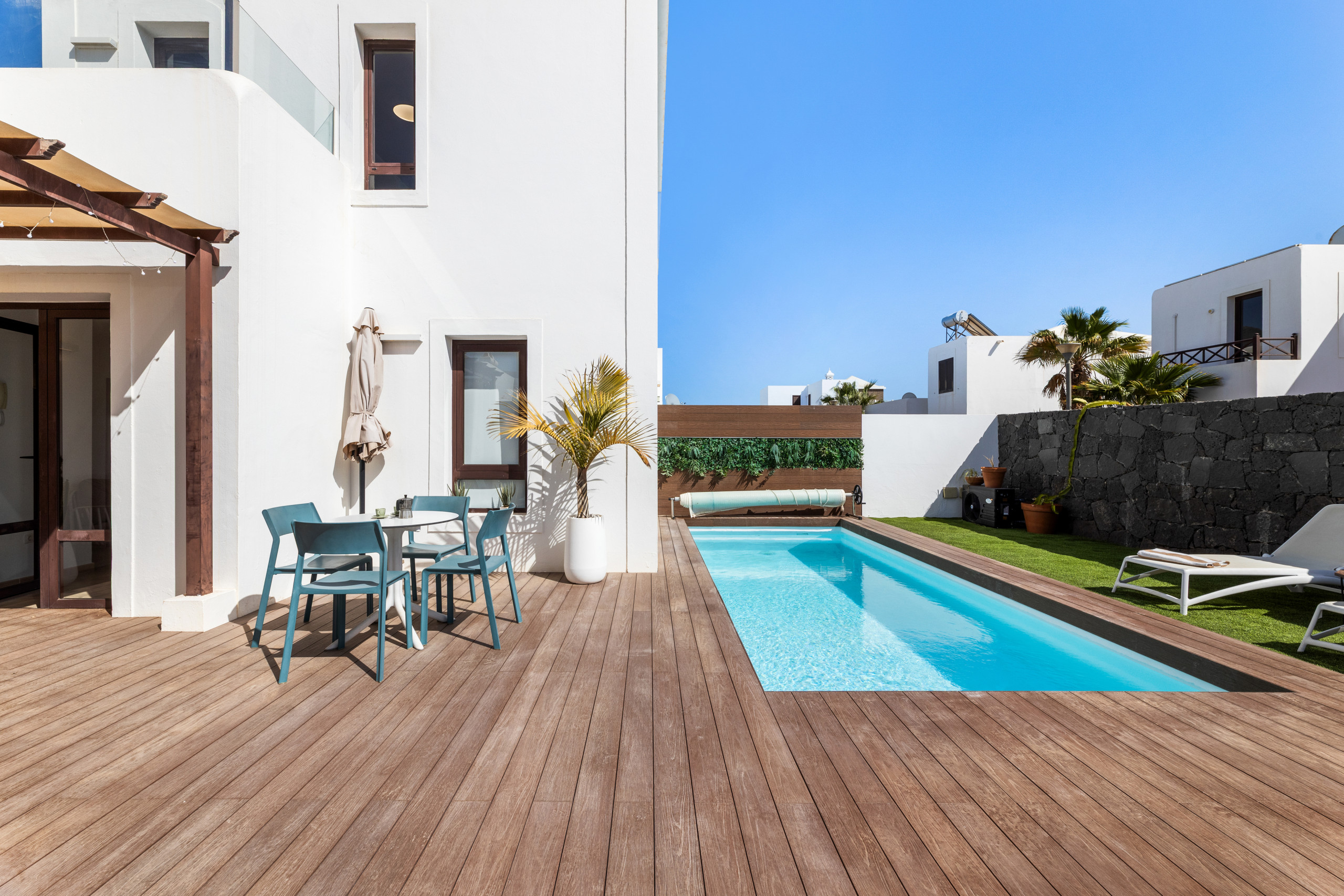 A private swimming pool, surrounded by sun loungers and green areas, where you can enjoy the sun of Lanzarote in complete privacy.